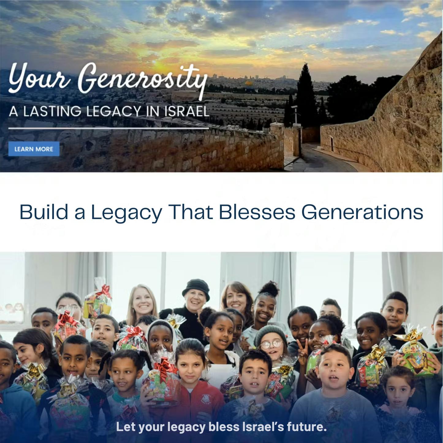 Learn about how planned gifts can support Israel while also helping to provide a secure future for your loved ones. Your kindness to bless the Jewish people with practical demonstrations of Christian love will be a blessing to those who follow, and it will ensure that the mission of Bridges for Peace will continue far into the future.
