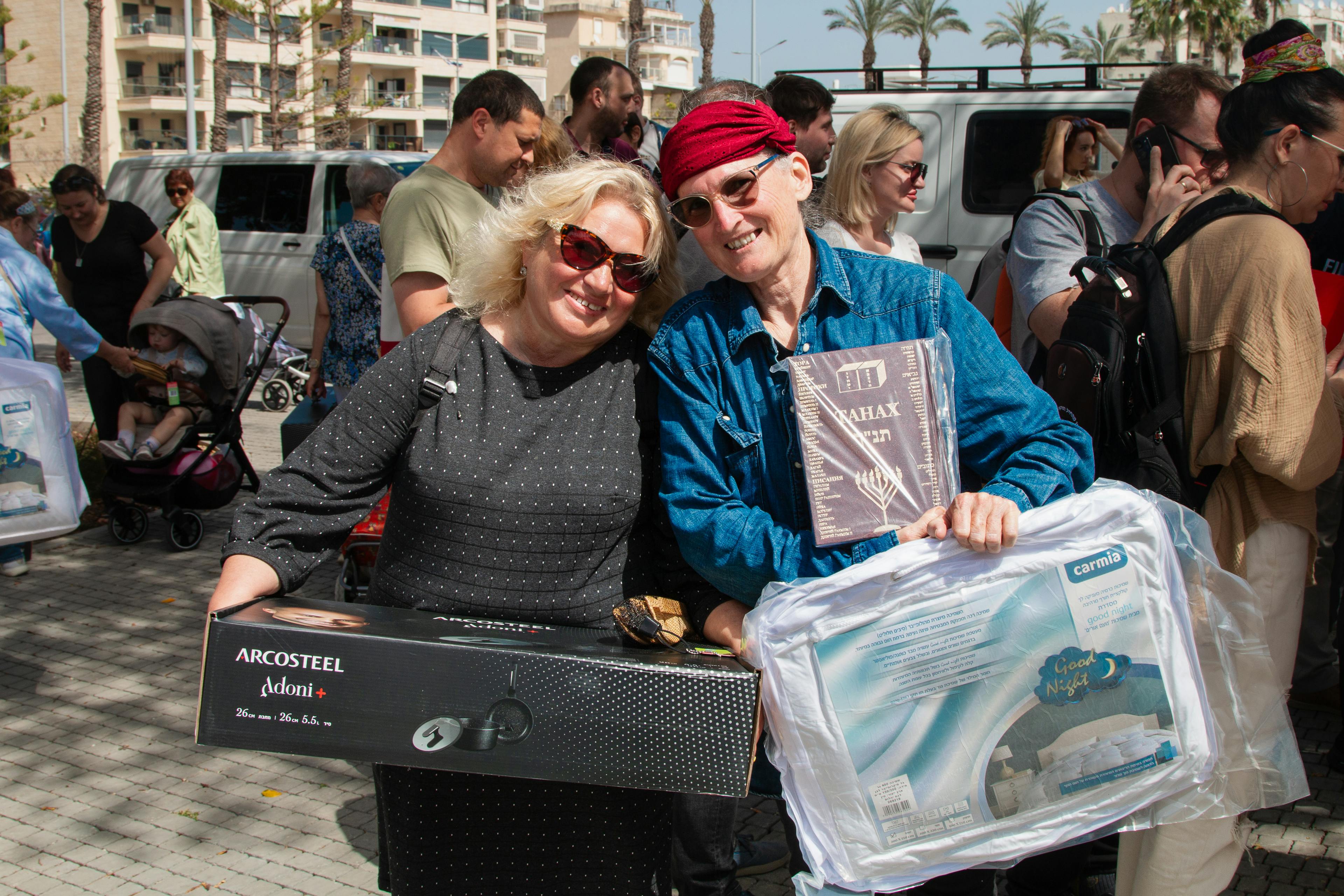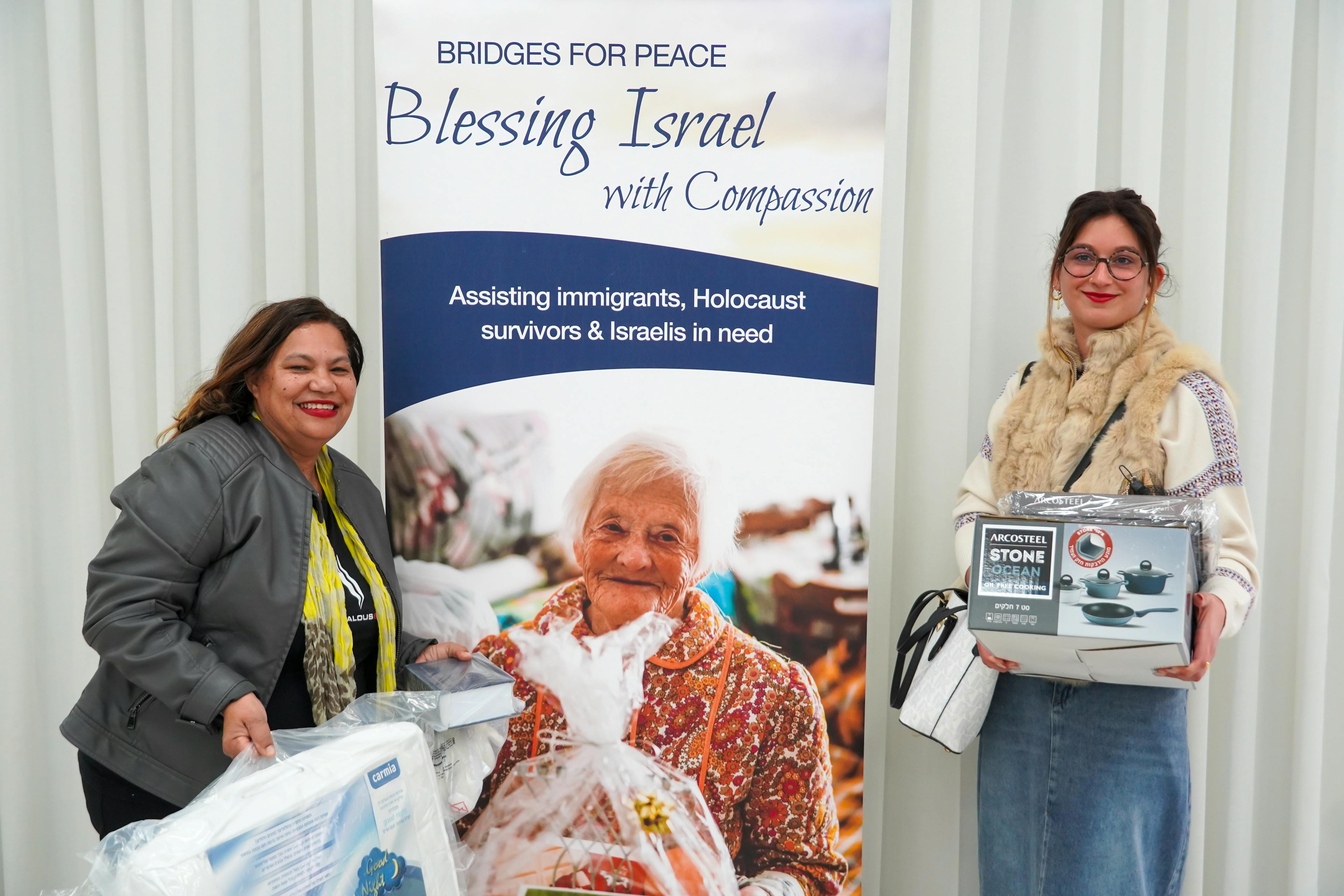 Larisa, with her husband Gennadi are from Belarus and Elena with her 14 year old daughter Alexandra, is from Ukraine. The two families both made Aliyah in December 2024. The two families also both ended up living in Rishon Le Zion, a city in Israel, located south of Tel Aviv, both facing adjustment to live their new lives together with their loved ones. As newcomers to Israel, they share similar challenges and naturally got to know each other more especially during the very difficult time with the recent war. When Larisa and Elena heard about the gift that Bridges for Peace (BFP) provides, they planned to come together to the Assistance Center in Jerusalem to receive the welcome gift. Both ladies were sharing how the recent days, uncertainty of not knowing what to expect, had an effect on them. They were so delighted and grateful when they saw what the gift was about and expressed it verbally. Larissa said it is of very high quality and that all of it is a necessity for her and her husband. Elena said that she is excited to take it home and hear what her daughter was going to say. She also said that they are starting from scratch and that the gift is very valued. They said that BFP and its people strengthen their hope that they and their families will finally be able to live a better life in peace. What a blessing it is to be a part of blessing the Jewish people that “come back to their homeland”.