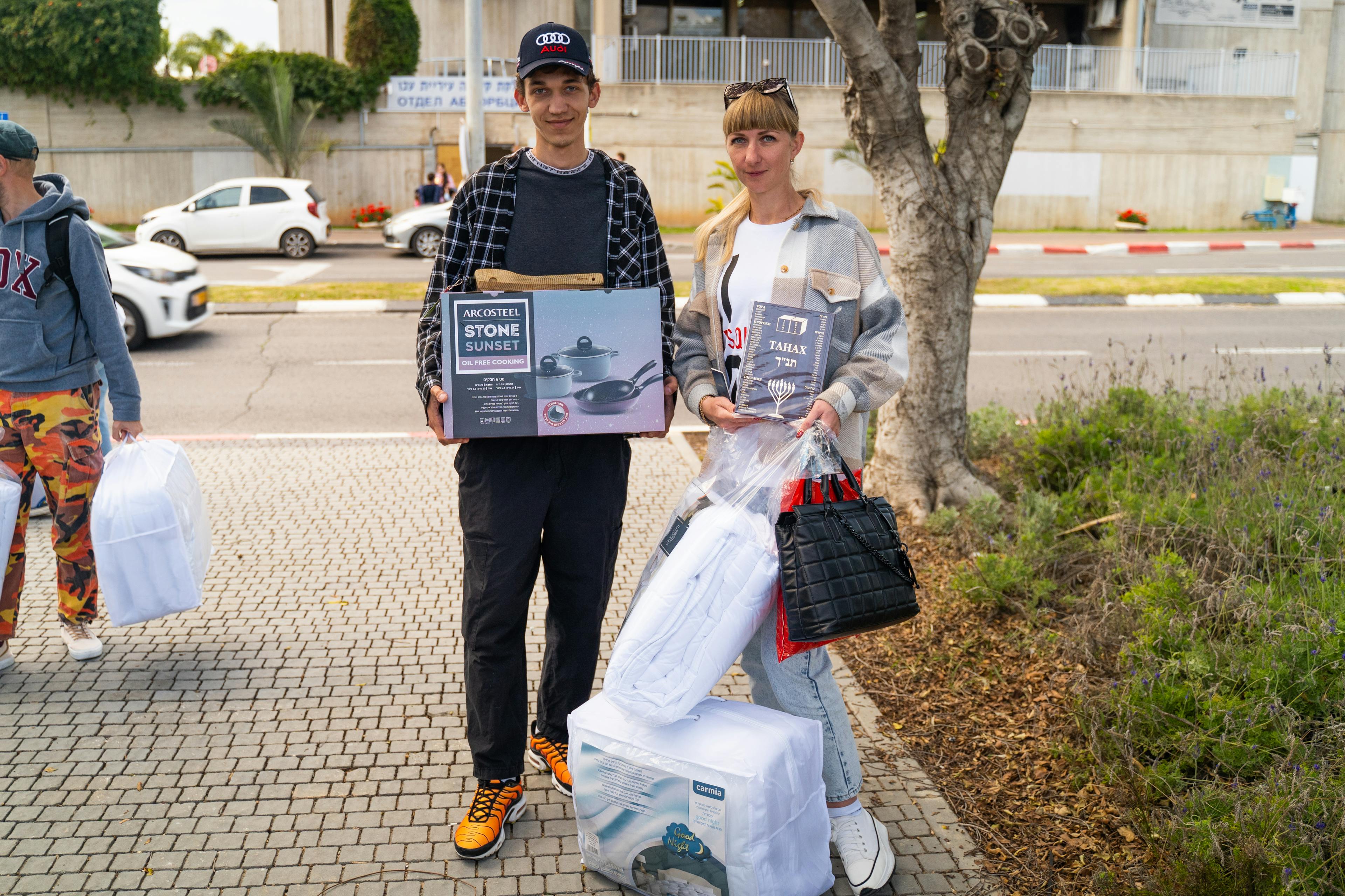 April was a special month! We welcomed new Immigrants on three separate occasions at the Bridges for Peace Assistance Center with a kitchen set, cutlery set, utensils, a Hebrew Bible and blankets. These immigrants made Aliyah from over 15 different countries, the majority of which were in Europe. This was the first time to have so many new immigrants from so many different countries in Europe at one event. As the BFP volunteers attended to them, spontaneous conversations followed and many of the immigrants expressed their surprise as they did not know what to expect or had different expectations of what they would encounter. It was also significant to serve a number of new immigrants that came from South Africa and their surprised reaction to get to know that there are also volunteers from South Africa that serve at BFP. This lady could not believe what she saw, looking at the pots and pans and cutlery set. It was exactly what she hoped to have. Her husband looked at her in amazement, grateful and happy for and with his wife.