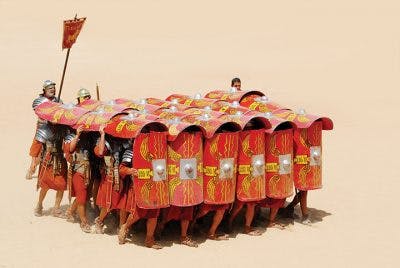 The soldiers of the perimeter quickly locked their shields together, creating an impenetrable wall around them all. The soldiers inside the perimeter raised their shields above their heads and locked them as well, effectively creating the semblance of a tortoise who had withdrawn its head into its shell. One soldier was commissioned to be the eyes of the testudo, shouting out orders so that each soldier, even the one in total darkness at the very center of the square, could hear that one voice and know where and how to step so that the entire mass could continue to move forward in an absolutely impenetrable formation.