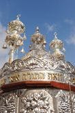 The word torah is feminine, so the Torah is treated like a bride. Several times, I have witnessed the joyful procession made by a synagogue’s rabbi and congregants through my neighborhood after they have either purchased a new scroll or been given one. A truck, heavily decorated in lights with a huge lit-up crown on top leads the way very slowly with joyful music, amplified to draw people out to the street. The Torah follows, carried under a canopy and accompanied by men dancing.