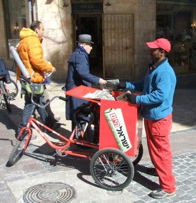 So, six days a week, on the streets of Jerusalem, you will see men in red coveralls with stacks of newspapers to hand to automobile drivers and passersby alike. Israel HaYom, a free paper with a circulation of 275,000, is only one of the means by which Israelis get their daily news-fix.