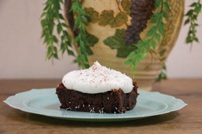Serve the cake with freshly whipped cream and a dusting of shredded coconut and cocoa powder.