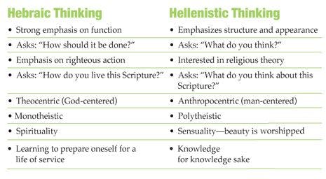 A quick review of some of the differences between Hellenistic and Hebraic thinking reveals the following: