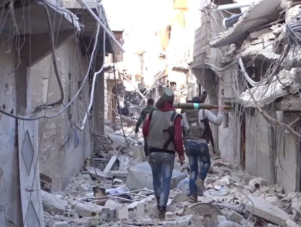 Anti-government fighters brandish their guns as they ride a vehicle in Syria's northern city of Aleppo. (Photo Credit: Omar Haj Kadour/AFP via Getty Images/JNS)